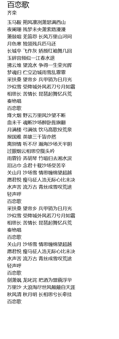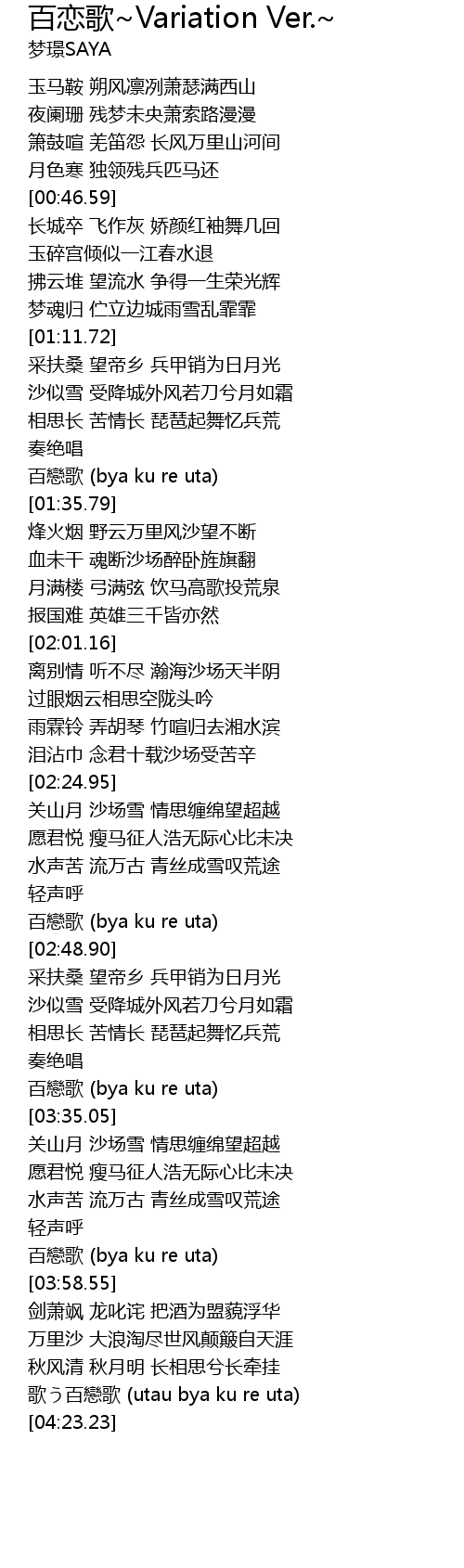 奏绝唱 百恋歌 (bya ku re uta) 烽火烟 野云万里风沙望不断 血未干 魂断沙场醉卧旌旗翻 月满楼 弓满弦 饮马高歌投荒泉 报国难 英雄三千皆亦然 离别情 听不尽 瀚海沙场天半阴 过眼烟云相思空陇头吟 雨霖铃 弄胡琴 竹喧归去湘水滨 百人一首の恋愛の歌をご紹介! 百人一首と聞いてどんなイメージが浮かびますか? 最近は『ちはやふる』や『から紅の恋歌』など百人一首がテーマの映画が流行りましたが、古文は苦手だしどんな歌があるのかよくわからないという人は多いですよね。 百恋歌 罗马拼音日文歌词中文歌词 107;
